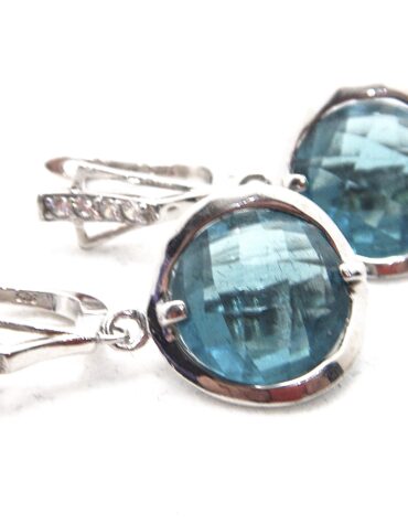 Rhodium plated 925 sterling silver earrings set with white & blue CZ 33 MM X 15 MM DIAM